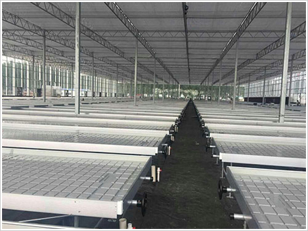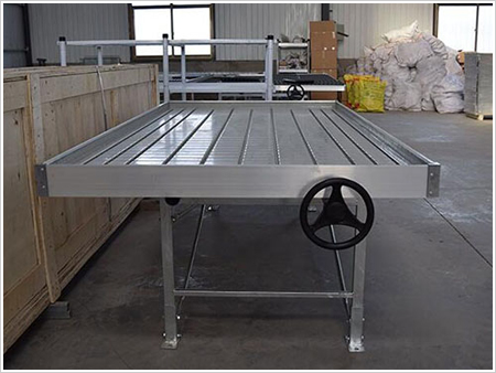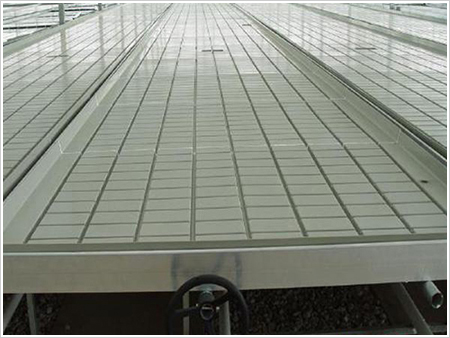 潮汐式灌溉移動苗床栽培床是一種床面為塑料結(jié)構(gòu)的栽培床,其床面采用塑料制作的潮汐式苗盤,它又稱底部灌溉式栽培床。這種潮汐式灌溉移動苗床采用基本與商品化金屬結(jié)構(gòu)栽培床相同的立柱、支撐,床面采用模壓成型的不透水塑料苗盤。灌溉時,苗盤內(nèi)注滿清水或營養(yǎng)液,并使其滯留一定的時間,以使作物依靠毛細作用通過花盆底部的排水孔吸收水分。之后灌溉水排出栽培床,或收集再利用,或直接排到當(dāng)?shù)氐南滤艿馈?/p>