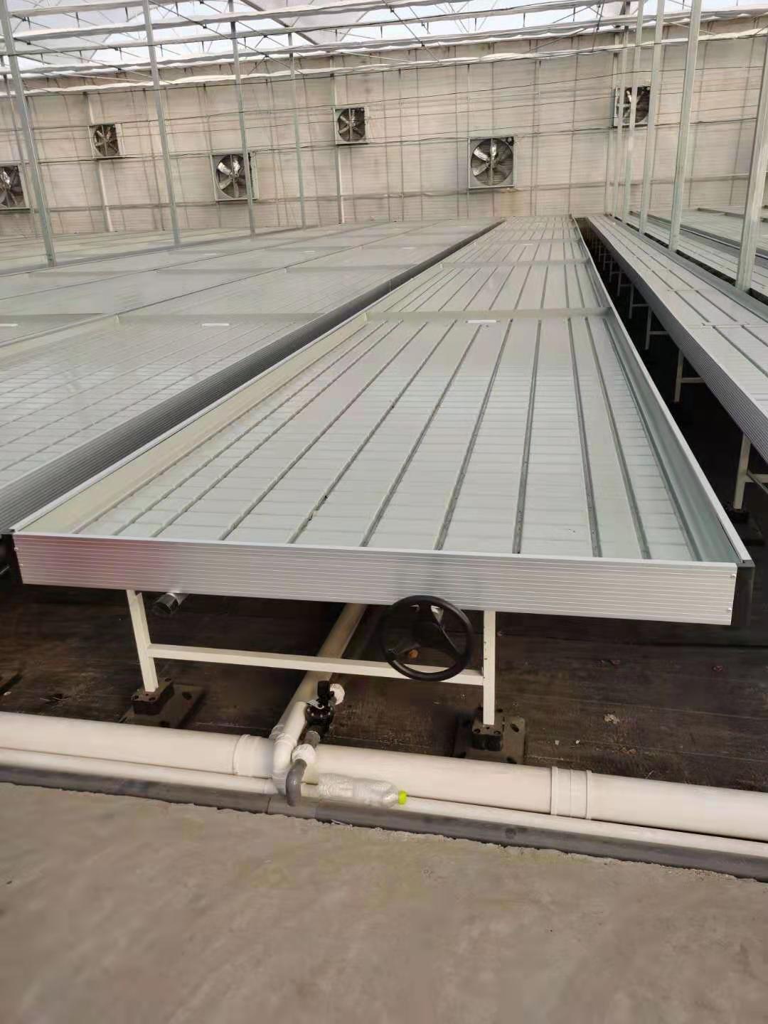 潮汐苗床面板材質均為可食用級別ABS環(huán)保材料,顏色為亮灰色,面板厚度為3毫米板材高溫電吸塑而成,面板分為兩種:一種為***立板,一種為拼接板,***立版需要每臺苗床上面均放置一套上下水系統(tǒng),拼接板為每臺苗床放置兩套上下水系統(tǒng),不同的設計應對不同的客戶要求,潮汐苗床支架均為螺桿微調熱鍍鋅支架,比原來的地腳調節(jié)更為精準,螺桿調節(jié)可謂解決了大家找平的一大難題。苗床尺寸的選擇目前國際上通用的潮汐式床箱的尺寸是4550mm*1690mm(長*寬)也就是我們常說的4.55米*1.7米床箱.因此我們在設計苗床時單個苗床長度應為4.55米的倍數(shù),寬度應為1.7米的倍數(shù),這樣可以使得苗床的利用率高,無浪費面積.根據(jù)平面圖上空地的長度及跨度大小,我們設計苗床為1.7m*18m和1.7m*22.5m兩種規(guī)格。苗床配置:本溫室共設置1.7m*18.2m的苗床37臺,1.7m*22.75m的苗床31臺,苗床面積為:平米??煞胖贸毕酱蚕鋽?shù)量為:303個??煞胖醚ūP數(shù)量為:14544個。