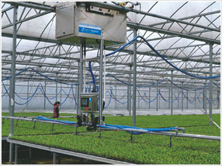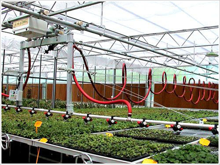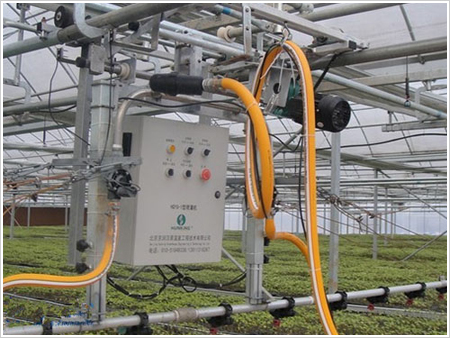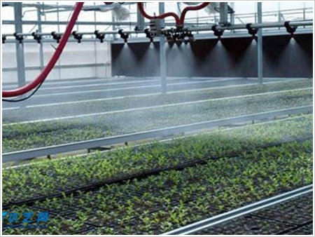 在溫室上部空間懸掛使用的微噴頭分為旋轉(zhuǎn)式、折射式、十字微霧式。通常在距地面2.5m—3.5m的高度處固定輸水管道,在管道上等距離安裝已選定噴灑直徑的微噴頭。為防止停灌時(shí)的余水滴漏給作物生長(zhǎng)帶來影響,專門增配有微噴防滴器。專用的十字霧化微噴比一般微噴頭更有效地調(diào)節(jié)室內(nèi)溫濕度,噴灑更均勻。該系統(tǒng)主要用于溫室內(nèi)較高植株、葉類蔬菜和苗床灌溉等。